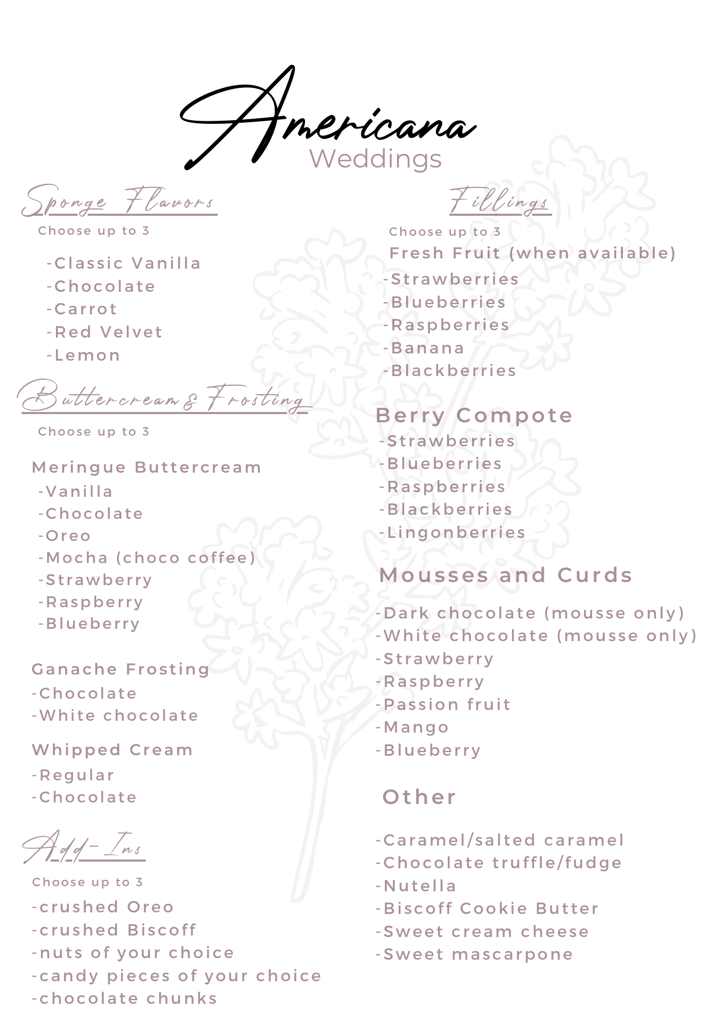Get in touch to schedule your tasting! Standard tastings include 3 sponge, 3 filling, 3 buttercream and 3 add-in flavors. You will also get a score card for you and your partner to rate and keep track of your favorites!